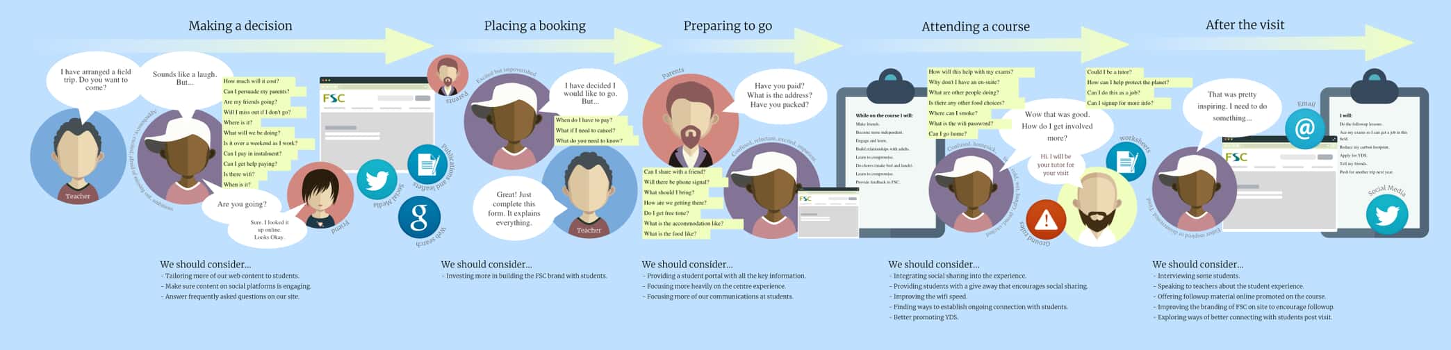 Each persona, and therefore the journey map itself, is not meant to be a perfect illustration of actual interactions. Rather, it’s a broad representation of the experience from the persona’s perspective.