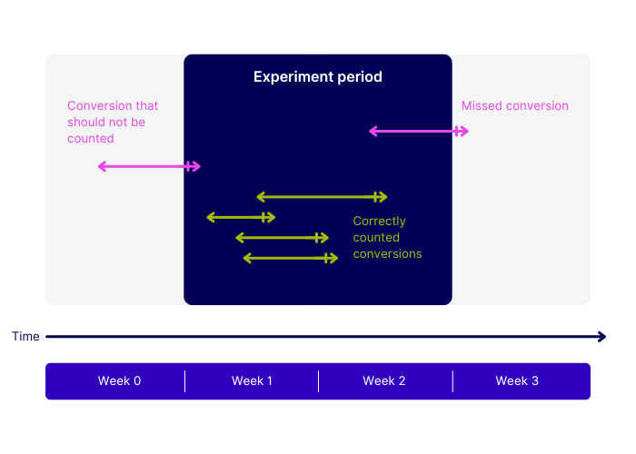 The delay between the effective variation and the conversion expedites the conversion rate. In order to mitigate this problem, the experiment period has to be twice as long as the standard conversion journey. Doing so ensures that visitors entering the experiment during the first half will have time to convert. You can expect that people who began their journey before the experiment and people entering during the second half of the experiment period will cancel each other out: The first group will contain conversions that should not be counted, and some of the second group’s conversions will be missing. However, a majority of genuine conversions will be counted.
