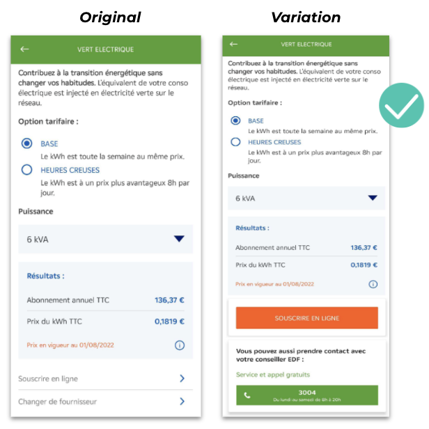 EDF testete die Auswirkungen einer Änderung des CTA-Designs in seiner App. (Quelle: Screenshots von EDF)