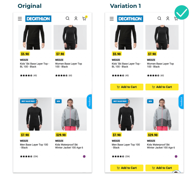 In der ursprünglichen Version, die unten zu sehen ist, wollte das Team von Decathlon APAC eine frühere Platzierung des „In den Warenkorb“-Buttons auf Mobilgeräten auf der Hauptseite unterhalb des Produktbildes testen, um einen positiven Rollout zu gewährleisten und den Uplift zu messen. In der ursprünglichen Version mussten die Nutzer erst auf das Produkt klicken, um zur Produktdetailseite zu gelangen, bevor sie diesen Button sehen konnten.