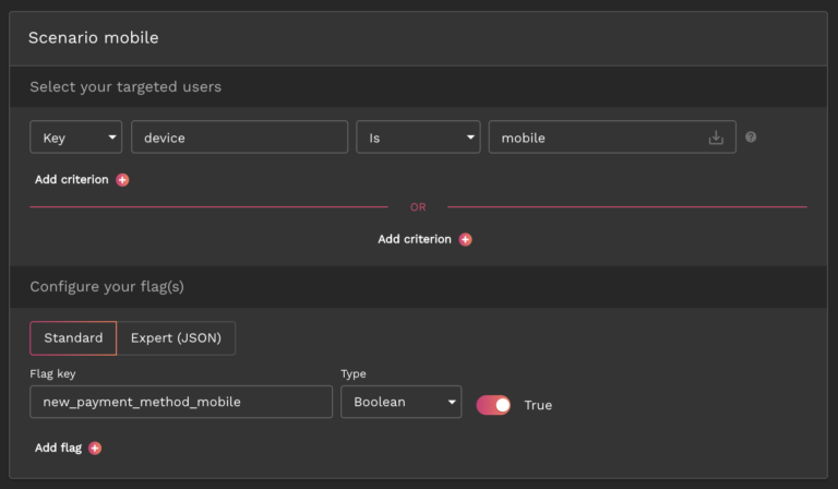 Anschließend kannst du zwei Szenarien definieren: eines zur Aktivierung der Funktion auf dem Desktop und ein anderes zur Aktivierung auf mobilen Geräten. Du konfigurierst dann das Flag, das die neue Zahlungsmethode für jedes Szenario aktiviert, wie im Bild unten bei „Scenario mobile“ auf dem Dashboard zu sehen ist.