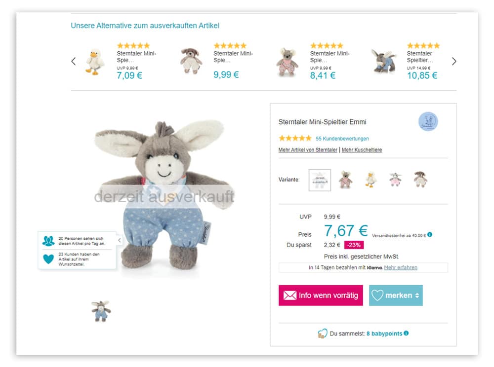 Durch diese beiden Methoden kannst du deinen Kunden interessante und relevante Artikel zeigen und sie so länger im Shop halten. Die beiden vorgestellten Basisstrategien kommen auf allen Produktdetailseiten von babymarkt.de zum Einsatz. Darüber hinaus setzt der Online-Händler aber auch auf ein paar Sonderstrategien.