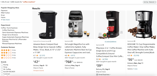 In diesem Beispiel ergibt eine Suche nach „Kaffeemaschine“ eine große Auswahl an Artikeln mit über 1.000 Ergebnissen. Die Website zeigt auch Filteroptionen oder „Attribute“ an, die Nutzer auswählen können, um die Ergebnisse auf das einzugrenzen, was am besten ihren Bedürfnissen entspricht.
