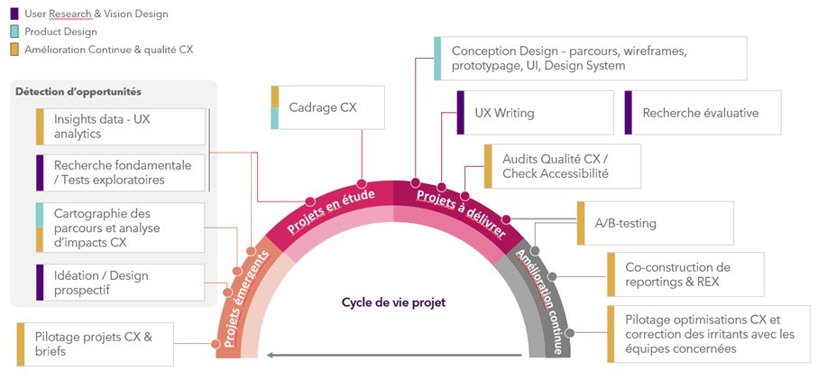 Au sein de l’entreprise, la direction CX joue un rôle important dans un cycle de vie projet et il existe différentes expertises ou actions qui peuvent être déclenchées aux différents niveaux du cycle.