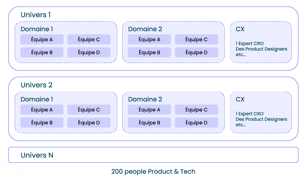 Dans chacun de ces univers se trouvent plusieurs domaines, par typologie de parcours par exemple : longue distance, courte distance, etc. Dans chacun de ces domaines, des équipes dédiées travaillent sur des sujets ou fonctionnalités précises concernant ces parcours.