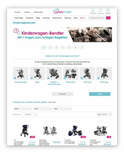 Par exemple, lorsqu’il s’agit d’acheter une poussette, les futurs parents peuvent se sentir dépassés par les innombrables modèles disponibles. La vente guidée les aide à réduire leur choix grâce à des questions ciblées, ce qui leur permet de trouver la poussette idéale. C’est ce que montre l’exemple de babymarkt.de, qui utilise la fonctionnalité Guided Selling d’AB Tasty pour offrir à ses clients une meilleure expérience d’achat.