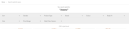Dans l’exemple d’Amazon mentionné plus haut, les facettes sont placées verticalement sur le côté gauche de la page. Cependant, certains sites optent pour un placement horizontal, comme on peut le voir sur le site d’ASOS :